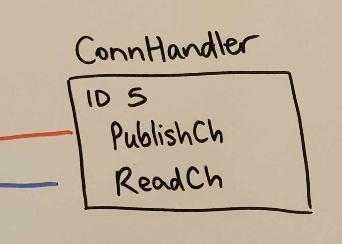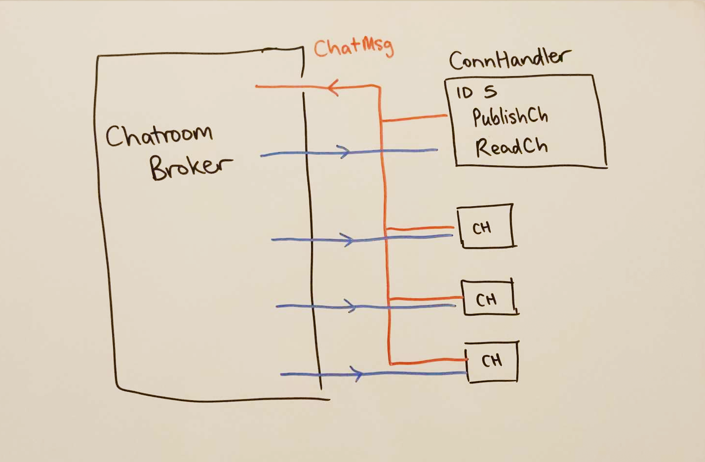 So ChatroomBroker would have the one PublishCh that is shared among all ConnHandlers, and only ChatroomBroker will wait and read from it. Then, it will have a slice of ConnHandlers, each with their own ReadCh that ChatroomBroker will write to when it has received a message through PublishCh.
